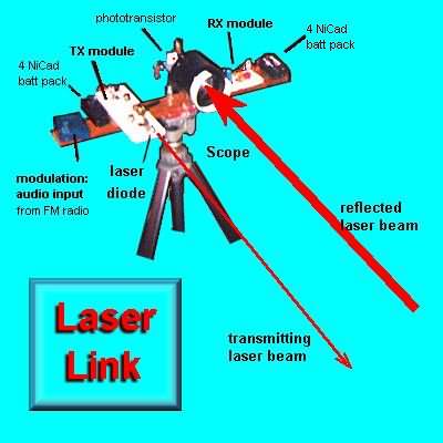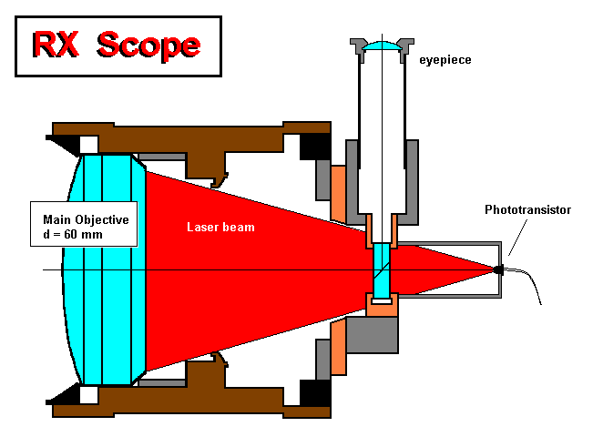 An example of the general arrangement of the laser transmitter TX and receiver RX is given in the following picture. In this case the signal may be bounced over a reflecting surface (retrocube for example) or just making contact with another station identical to this one.