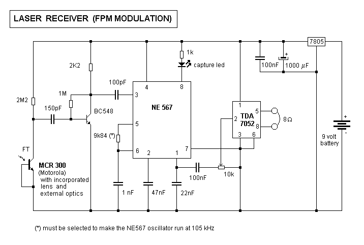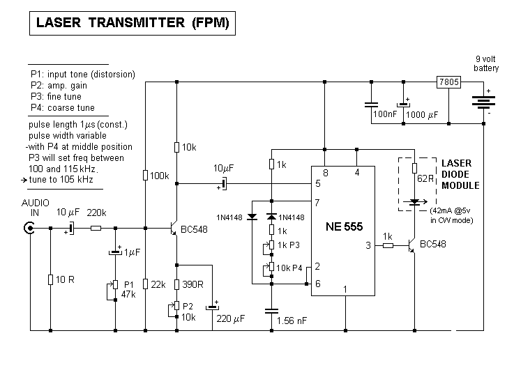 This is a very interesting project about transmitting an audio signal over a laser beam. The idea came to me after analyzing the driver circuit of a cheap keychain laser I've disassembled. This laser diode may be easily modulated in frequency (turning the laser on and off rapidly) thus, the input signal amplitude is transformed in small frequency variations over a central "carrier" frequency, this modulating technique is called FPM -Frequency Pulse Modulation-