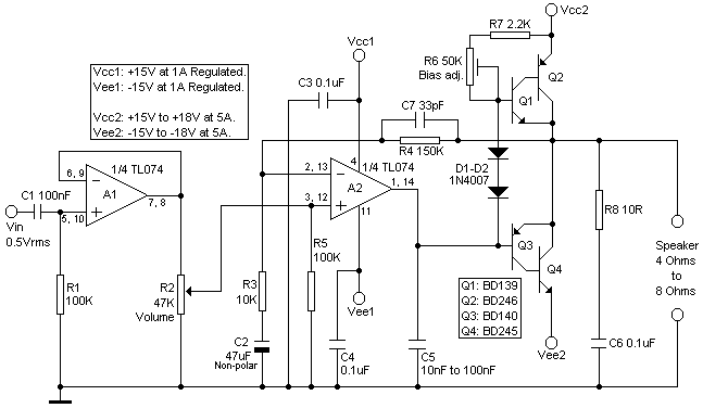 The amplifier is based on the commonly used class-AB complementary power amplifier with compound pair output transistors. The system uses a TL074 quad opamp to drive the output transistors. As can be seen from figure 1, A2 is used to set the voltage gain of the amplifier. Assuming the voltage gain of a common collector stage to be unity, the overall voltage gain of the amplifier is equal to (R4 / R3) + 1, i.e. the gain of a non-inverting OP-AMP (16 or 24dB, in this case). Since the output transistors are within the feedback loop of A2, A2 also acts to linearise the input characteristic of the complementary pair Q1/Q2 & Q3/Q4. This allows for greater mismatch between the NPN-PNP transistors.