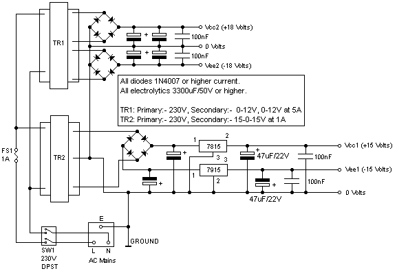 The above schematic contains 2 separate transformer/rectifier/filter chains. This arrangement requires that the upper transformer has output voltages that are very close to each other (of course, some variation is acceptable as long as the final DC voltages are within 0.5V to 1V of each other). The upper chain is for the power transistors (high current) and the lower one is for the op-amps (low current). The only stringent requirement here is that the upper transformer must be able to supply a current of at least 5 amperes on each half cycle of the output (this is needed for good regulation, especially when the amplifier is operated at or near maximum power).