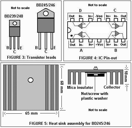 Figures 3 and 4 show the transistor leads and IC pin-out respectively. As with any power system, this amplifier also produces some heat in it's output devices and these must be provided with a proper means to dissipate the generated heat. The transistors BD245/246 must be mounted on proper heat sinks such as the one shown in figure 5. The collectors of the transistors must have a proper thermal (NOT electrical) contact with the heat sinks. A mica insulator must be sandwiched between the collector and the heat sink. Also, a plastic "through and through" washer must be inserted in the transistor & heat sink holes such that the screw used to secure the transistor to the heat sink is electrically insulated from both the collector as well as the heat sink. Use of some heatsink compound (a kind of paste) on the faces of the mica insulator improves the heat transfer from the collector to the heat sink.