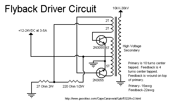 This is probably the most well known flyback transformer driver circuit. It uses two 2N3055 power transistors in a push-pull oscillator configuration. The value of the resistors is not that critical. In fact you can even use a 1/2W for the 27 ohm resistor, but it may burn out if it is left to run for a long time. This circuit will accept voltages up to about 24V, but I would not go any above this as you risk destroying the flyback transformer. Try to find an old flyback. It should have a rather disk shaped high voltage winding, rather than a cylindrical one. Also it should not have a rectifer built in. The rectifer decreases the performance of this circuit greatly since it cuts off the other cycle. You should not run this on any power supply which is expensive. This is because the circuit will produce lots of feedback and can destroy sensitive components in a decent linear or switching power supply. If you do run it on a good power supply be sure to put a large filter capacitor across the input of this circuit. A choke is also recommended. You may also get a shock off of components on the primary side, this just shows how much cemf is generated.