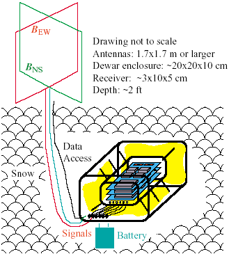 Fig. 1. Ultra-low-powerELF/VLFreceiver system for use in polar regions. Depicted here is a single autonomous system, enclosed in a dewar (for temperature control) and buried ~2 to 3 ft deep in the snow immediately underneath the sensors, which consist of two crossed magnetic loop antennas. The ultra-low-power ELF/VLF receiver system consists of several Application Specific Integrated Circuit (ASIC) chips, which together with associated external circuitry and nonvolatile memory, fits into an enclosure no larger than a single paperback book, and operates continuously while consuming only a total of ~10 milliwatts. At the same time, the new receiver is much lower cost (<$2000 per unit, including antennas and battery), much more robust and easy to duplicate (due to integrated design and much fewer components), and has many times the capability and flexibility of previous systems, in terms of bandwidth and programmable on-board DSP processing power. |