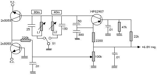 Construction and Operation: First breadboard the circuit on a prototyping board (available at Radio Shack and other sources) to make sure it functions properly before soldering. Place the breadboarded (unsoldered) VFO in close physical proximity to the receiver, turn on the receiver, attach a mid-band-of-interest 80-meter crystal to the receiver's oscillator and tune the receiver to 80 meters. Apply power to the VFO and adjust its 80-meter coil slug until a loud signal is heard. Adjust slug to zero-beat the signal when the VFO's tuning pot is at mid-position . Make sure the VFO's switch is set for the right band! Check the VFO's tuning range by using crystal frequencies at either side of mid-band in the receiver's oscillator section. The range should be about 50 kHz.
