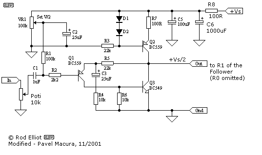 The other possibility is Rod Elliott's DoZ preamp (see www.sound.au.com or http://sound.westhost.com). An article describing the use of this MOSFET power follower with Rod's preamp can be seen at http://sound.westhost.com/project83.htm as "Project 83". The schematic of the DoZ preamp (©Rod Elliot, ESP, see his pages, and you can also order PCB's for the DoZ from him..) modified for this purpose can be seen in Fig.2.