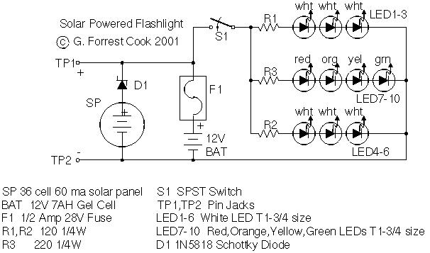 1x 12V 7AH sealed lead acid battery, Panasonic LC-R127R2P or Yuasa NP7-12, from DigiKey 1x GM-684 12V 60ma solar panel, p/n 08SLC09 from Elecronix Express 1x red LED, T1-3/4 size 1x orange LED, T1-3/4 size 1x yellow LED, T1-3/4 size 1x green LED, T1-3/4 size 6x white LEDs, T1-3/4 size from Jameco 2x 120 ohm 1/4 W resistors 1x 220 ohm 1/4 W resistor 1x 1/2 Amp 28VDC fuse 1x fuse holder 2x crimp on battery clips 3x wire nuts 1x 1N5818 diode 1x spst toggle switch 2x pin jacks 1x box large enough to fit the battery and solar panel. misc hardware