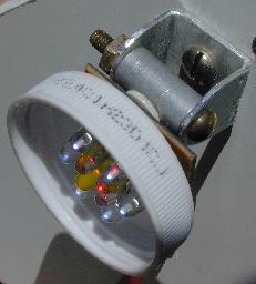 The LED mounting system is somewhat fragile but allows the light to be rotated up and down. The cylinder is made from an unthreaded spacer with a 4-40 screw hole tapped in the middle for connecting the LED circuit board. The C mount is just a piece of flat aluminum that I bent in a vise, hammered into shape, trimmed with a pair of tin snips, and filed smooth. The white diffuser around the LEDs is a cap from a juice bottle that shields the intense white light from the side.